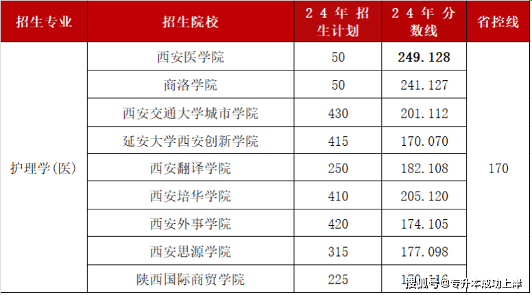 24年护理学招生院校共9所,此中公办有2所,平易近办有7所。招生人数共2565人,其安交通大学城市学院招生最多,430人;西安医学院和商洛学院招生起码,都只要50人。24年公办登科分数线分;平易近办登科分数线最高的是西安培华学院,205分。