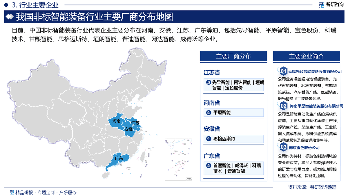 目前,中国非标智能配备行业代表企业次要分布正在河南、安徽、江苏、广东等迪,包罗先导智能、平原智能、宝色股份、科瑞手艺、首熙智能、思格迈斯特、垣朗智能、普迪智能、网达智能、威得沃等企业。