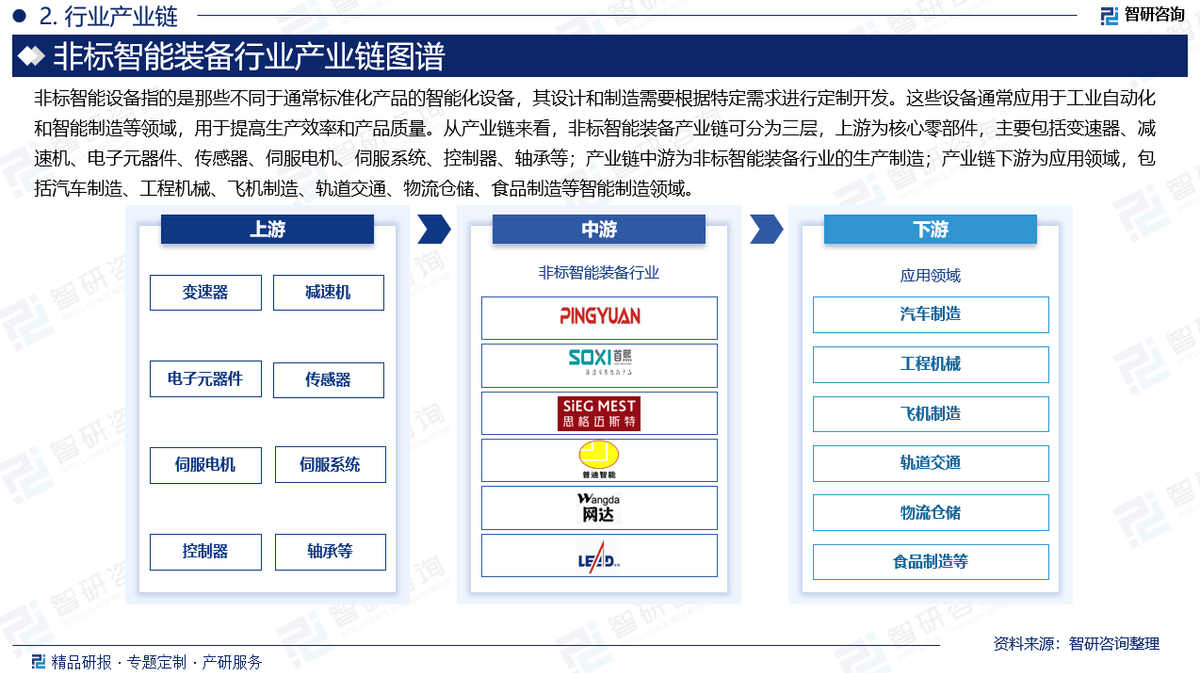 做为一个了中国非标智能配备十余年成长的专业机构,智研征询但愿可以或许取所有努力于取非标智能配备行业企业联袂共进,供给更多无效消息、专业征询取个性化定制的行业处理方案,为行业的成长尽绵薄之力。1:本演讲焦点数据更新至2024年12月(演讲中非上市企业受企业信批影响,相关财政目标或存正在必然的畅后性),演讲预测区间为2025-2031年。2:除一手调研消息和数据外,国度统计局、中国海关、行业协会、上市公司公开演讲(招股仿单、让渡仿单、年报、问询演讲等)等权势巨子数据源亦配合形成本演讲的数据来历。次要采访对象有企业高管、行业专家、手艺担任人、下旅客户、分销商、代办署理商、经销商以及上逛原料供应商等;二手材料来历次要包罗全球范畴相关行业旧事、公司年报、非盈利性组织、行业协会、机构及第三方数据库等。3:演讲焦点数据基于智研团队严酷的数据采集、筛选、加工、阐发系统以及自从测算模子,确保统计数据的精确靠得住。4:本演讲所采用的数据均来自合规渠道,阐发逻辑基于智研团队的专业理解,清晰精确地反映了阐发师的研究概念。智研征询做为中国财产征询范畴带领品牌,以“用消息驱动财产成长,为企业投资决策赋能”为品牌。公司融合定量阐发取定性阐发方式,用自从研发算法,连系行业交叉大数据,通过多元化阐发,挖掘定量数据背后根因,分解定性内容背后逻辑,客不雅实正在地阐述行业现状,审慎地预测行业将来成长趋向,为客户供给专业的行业阐发、市场研究、数据洞察、计谋征询及相关处理方案,帮力客户提拔认知程度、盈利能力和分析合作力。次要办事包含精操行研演讲、专项定制、月度专题、可研演讲、贸易打算书、财产规划等。供给周报/月报/季报/年报等按期演讲和定制数据,内容涵盖政策监测、企业动态、行业数据、产物价钱变化、投融资概览、市场机缘及风险阐发等。
