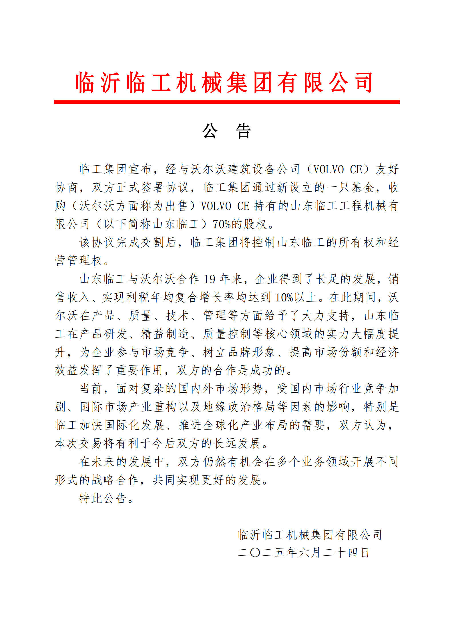 6月24日, 临沂临工机械集团无限公司发布通知布告称,临工集团经取沃尔沃建建设备公司(VOLVO CE)敌对协商,收购(沃尔沃方面称为出售)VOLVO CE持有的山东临工工程机械无限公司(以下简称山东临工)70%的股权。通知布告内容如下: