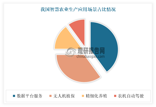 从出产使用场景来看,目前我国聪慧农业出产环节次要无数据平台办事、无人机植保、精细化养殖、农机从动驾驶。此中数据平台办事占比最高,达到40%;其次是无人机植保,占比为35%,而精细化养殖、农机从动驾驶占比各部位15%、10%。