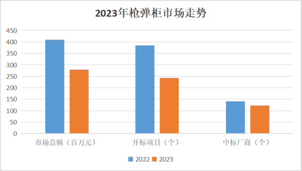 2023年枪弹柜行业市场研究演讲已发布,内容包含枪弹柜市场现状、合作环境、手艺及趋向等方面解读研究。演讲内容具体如下:为加快实现新时代强军方针,推进JD现代化历程,刀兵室智能化扶植照旧存正在, 但项目集成化及实施难度较大,对各厂商要求更高,2023年全年智能化扶植需求占整个枪弹柜市场需求的27。98%,高于2022年的16。11%,但项目总量缩减,全体较2022年持平。方面因为市场逐步饱和,对枪弹库室的消息化、数字化、智能化需求大幅降低,这对企业优化办事针对已有客户加强客户粘性提出了更高的要求,也对企业拓展新范畴能力提出了新的。枪弹柜及相关产物继续向规范化、智能化、消息化、人道化标的目的成长,更强调智能取交互体验。枪弹柜厂商,正在完美原有焦点产物的同时,加码研发投入,节制器算 力显著加强,环节手艺自从可控程度大幅提拔,零部件国产化历程加速。2023 年全国枪弹柜市场发卖总额为2。8亿元,此中公开投标项目共243个,较 2022 年削减37%。公开市场中标厂商 123家。