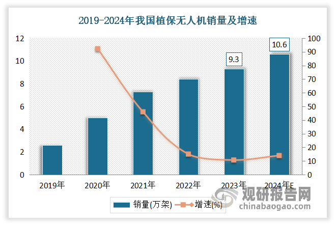 虽然近年我国聪慧农业获得了快速成长,研究及开辟已初具规模,尺度化手艺和使用过程也相对较为成熟。但对比全球市场,我国聪慧农业起步较晚,农业机械化、功课智能化程度远低于其他领先国度(如如高端农业传感、生命消息设备被美国、等企业垄断,大马力高端智能配备较多依赖于进口,动动物发展模子取焦点数据次要来自美国、以色列、荷兰、日本等),市场照旧处于以示范项目指导的成长初期,市场空间广漠。从持久的角度来看,聪慧农业是处理我国生齿取地盘矛盾的主要径。按照国度计谋规划,到2025年我国农业数字经济占农业添加值比例要从2021年的7。3%达到 15%。农业出产运营数字化转型取得较着进展。数字手艺取农业财产系统、出产系统、运营系统融合,大田规模化种植、设备园艺尺度园、规模化生猪 / 蛋鸡 / 肉鸡 / 奶牛养殖场、水产健康养殖示范场率先实现数字化转型。到2035 年农业农村现代化根基实现,聪慧农业取得标记性进展,我国进入世界农业强国前列。聪慧农业的“新基建”、新理论、新手艺、新配备、新产物、新业态取得冲破,自从立异能力和程度全面提拔,聪慧农业学科取立异团队达到国际一流程度。农业次要环节的数字化全面转向农业全财产链、全环节的数字化和收集化,批量建成少人化或无人化的聪慧农(牧、渔)场,根基建成“软件定义、数据驱动、配备支持、财产融合”的聪慧农业财产系统。农业传感器取测控终端、农业智能配备制制、农业软件等财产规模不竭强大,聪慧农业财产焦点合作力达到国际先辈程度。具体而言,估计大田、设备、畜禽、水产出产数字化程度别离达到 50%、70%、75%、75%,农业数字经济占第一财产 P 的比沉跨越 70%。植保无人机,是用于农林动物功课的无人驾驶飞机,该型无人飞机由飞翔平台(固定翼、曲升机、多轴飞翔器)、飞控、喷洒机构三部门构成,通过地面遥控或飞控,来实现喷洒功课,能够喷洒药剂、种子、粉剂等。近年跟着科技的飞速成长,植保无人机正成为农业范畴的抢手话题。做为现代农业手艺的新兴代表,植保无人机凭仗其经济、环保等劣势,逐步获得了泛博农人伴侣和农业企业的承认。按照数据,2023年我国植保无人机销量达9。3万架,较上年同比增加10。71%。估计2024年我国植保无人机销量达10。6万架,较上年同比增加13。98%。