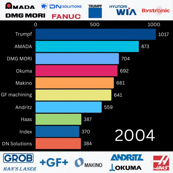 还有一张来自Martin Engels的动图很是成心思,展现了过去20年,行业领先的机床制制商(TOP10)正在发卖额(百万欧元)方面是若何演变的。