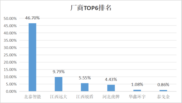 2023年枪弹柜行业合作照旧激烈,但市场总体仍由头部企业从导,头部厂商合作劣势进一步扩大。正在全国公开投标项目中,2023年全国枪弹柜行业TOP6厂商中标金额累计近1。9亿,市场拥有率合计68。42%;前六以外的117家厂商中标金额累计近0。87亿,合计市场拥有率为31。58%。